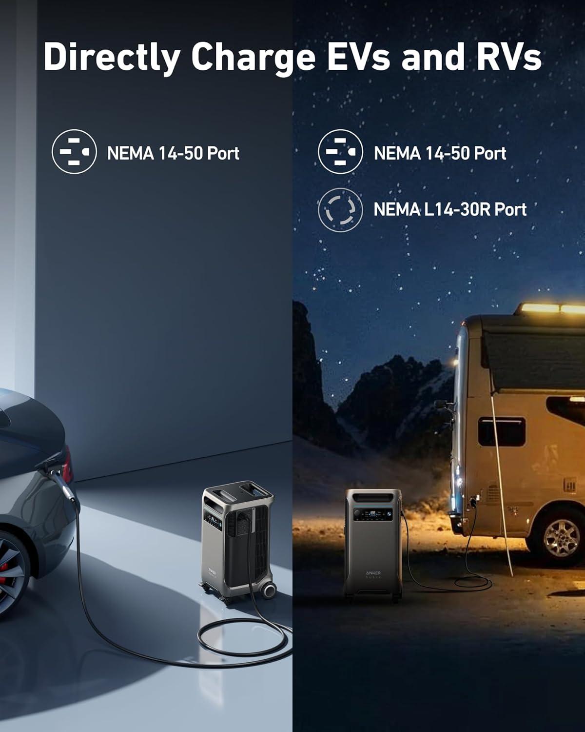 Directly Power EVs and RVs: You don't need complicated grounding accessories to recharge your vehicles. Just plug in directly via the NEMA 14-50 and L14-30R (not for EV) ports for simple convenience.